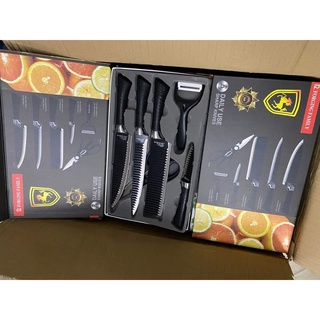 + Free ShippingJuego de cuchillos color negro, hojas de acero inoxidable, acompañado de un pelador y tijeras.